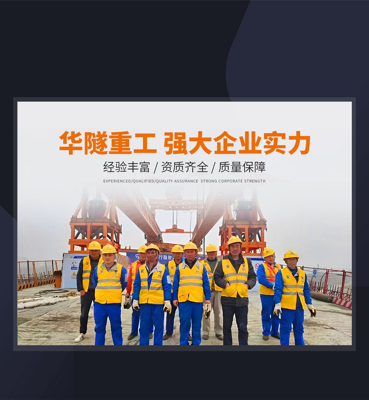 河南華隧重工機械裝備有限公司主要從事通用門式起重機、橋式起重機、電動單梁起重機,輪胎式起重機、架橋機、提梁機、遠梁平車、鋼絲繩電動萌蘆、卷揚機、起重配件制造、銷售:起重機械租賃、安裝和維修,起重設備園收,機械設備維修,鋼結構工程承包,橋梁工程及技術咨淘服務,銷售五金制品、機電設備:建設工程監理,建設工程設計,各類工程建設活動,建筑勞務分包,建筑物折除作業,施工作業,工程管理服務,土石方工程施工,裝如發運。  公司已通過IS0國際質量、環境、健康與安全三合一標準認證,特種設備制造許可證和特種設備安裝改造維修許可證。擁有完熟的質量管理體系。嚴格的管理制度,強大的生產能力和先進的檢測手段,在保證產品質量的同時,也具備了極強的市場競爭力。  公司堅持科技創新為理念,產品質量為核心,注重信譽,建立了減信可靠、快捷、思速。便利周到的售后服務網絡。  我們擁有的技術專家和技術服務隊伍為客戶提供充善的售前技術支持和全天候的售后服務體系,讓您無后顧之憂,享受一站式的超值服務。  “華隧重工,伴您成功“是華隧重工永遠的宗指,真被的希望與各界朋友攜手并進。共創輝準!